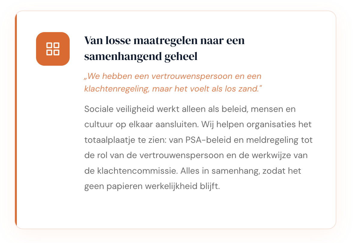 Beginnen bij het begin: onze scan voor ongewenst gedrag brengt in kaart hoe het er werkelijk voorstaat. Van daaruit bouwen we samen aan PSA-beleid, meldregelingen en een cultuur waarin mensen zich durven uitspreken. Stap voor stap, met begeleiding die blijft.