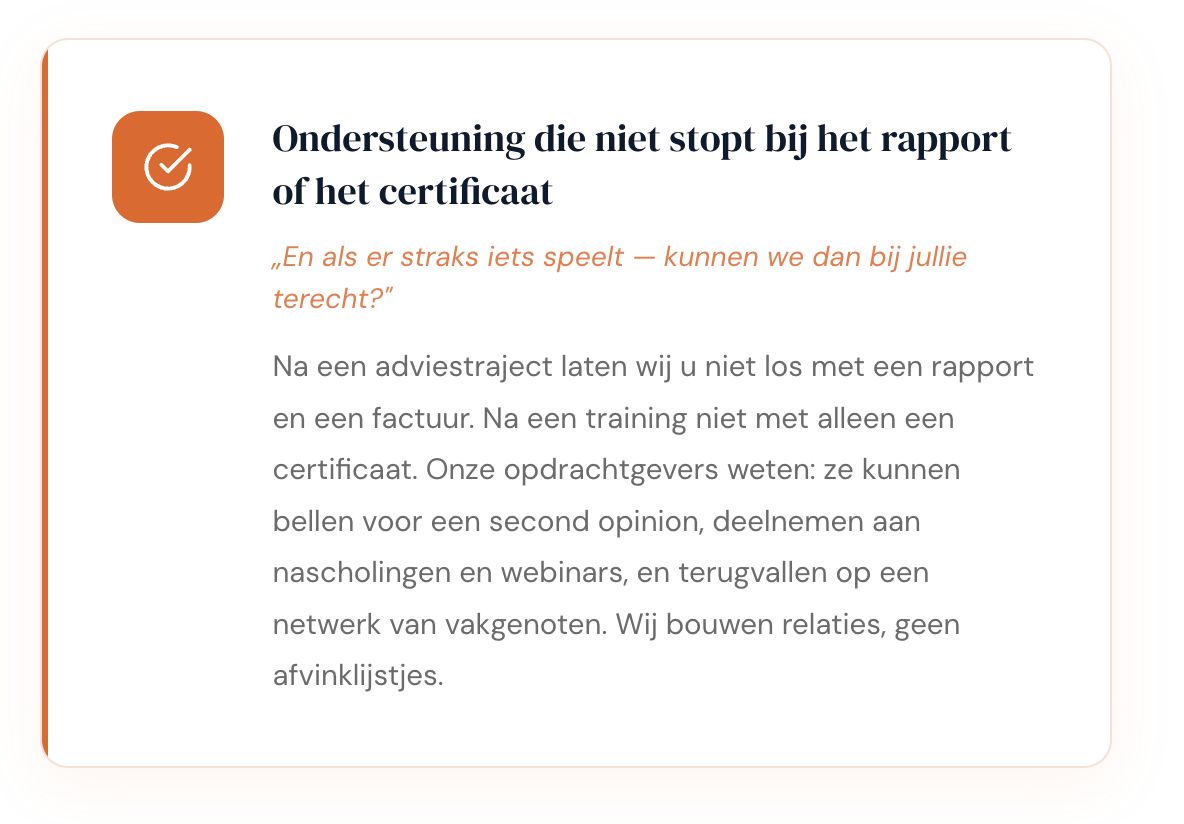 Dat horen we vaak. Onze 4-daagse opleiding brengt u van nul naar professioneel: juridisch kader, gespreksvaardigheden, grenzen bewaken. Na afloop weet u precies wat uw rol is — en voelt u zich zeker genoeg om die in te vullen.